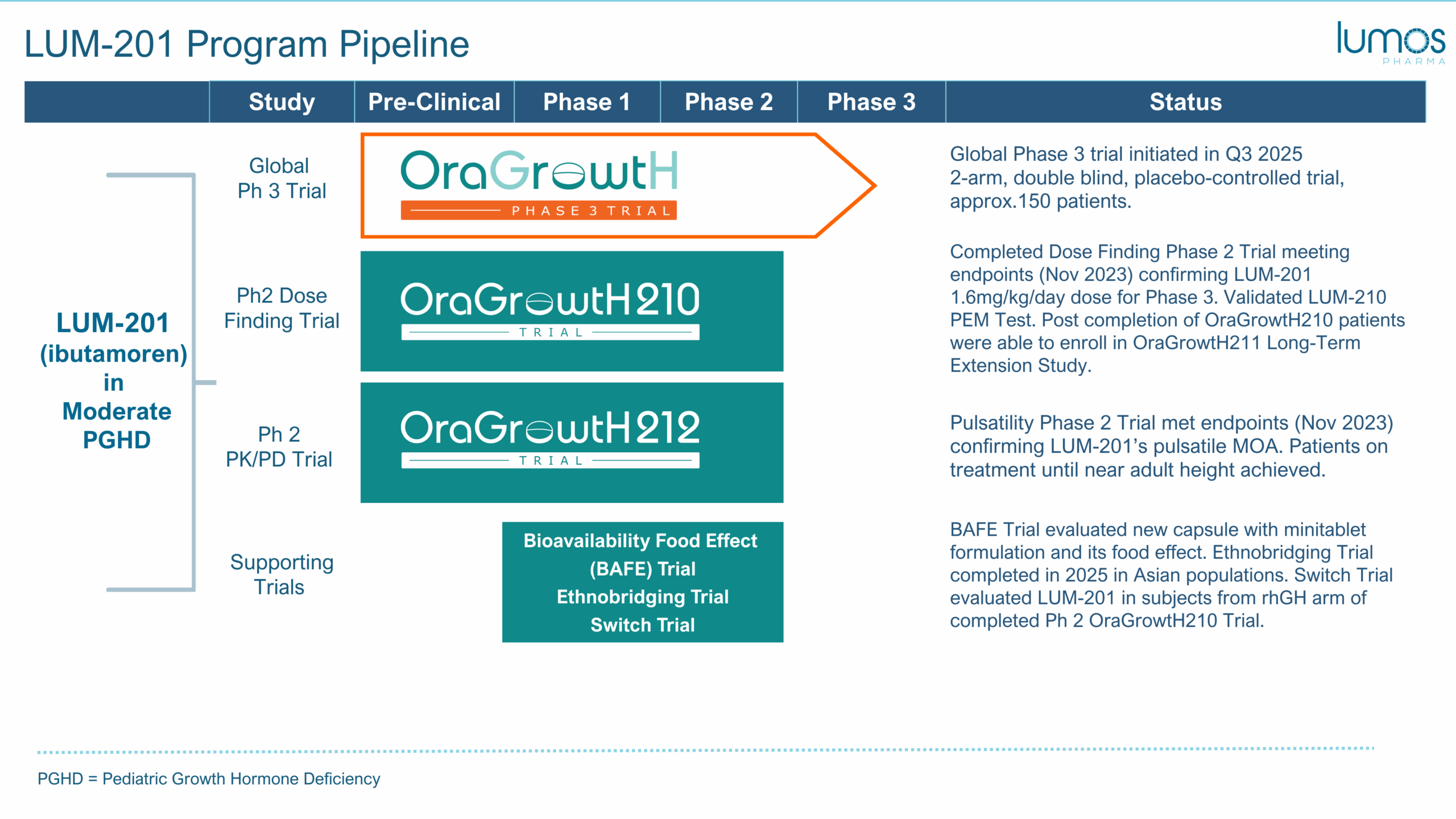 - Data from Phase 2 OraGrowtH210 and OraGrowtH212 Trials of LUM-201 in PGHD met all primary and secondary endpoints.